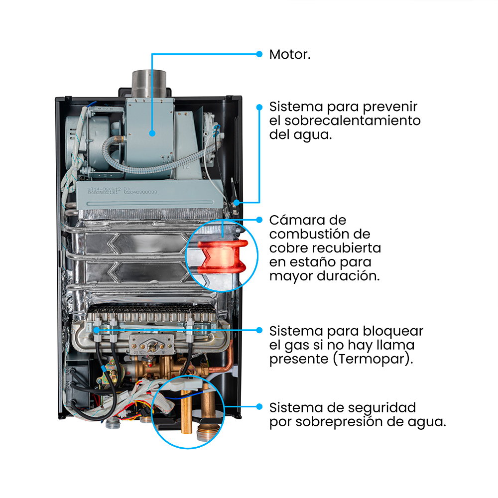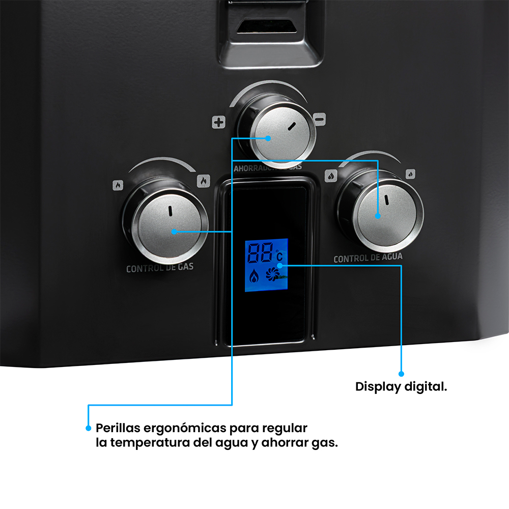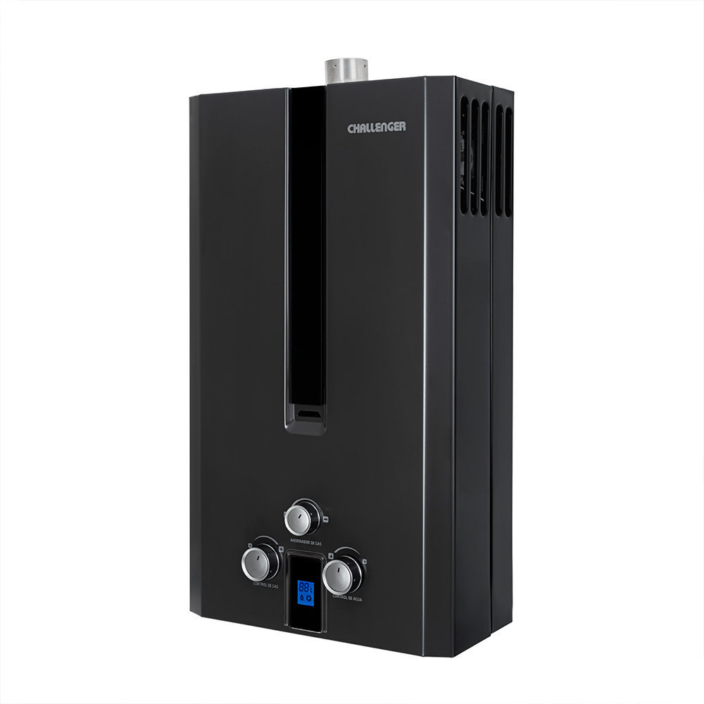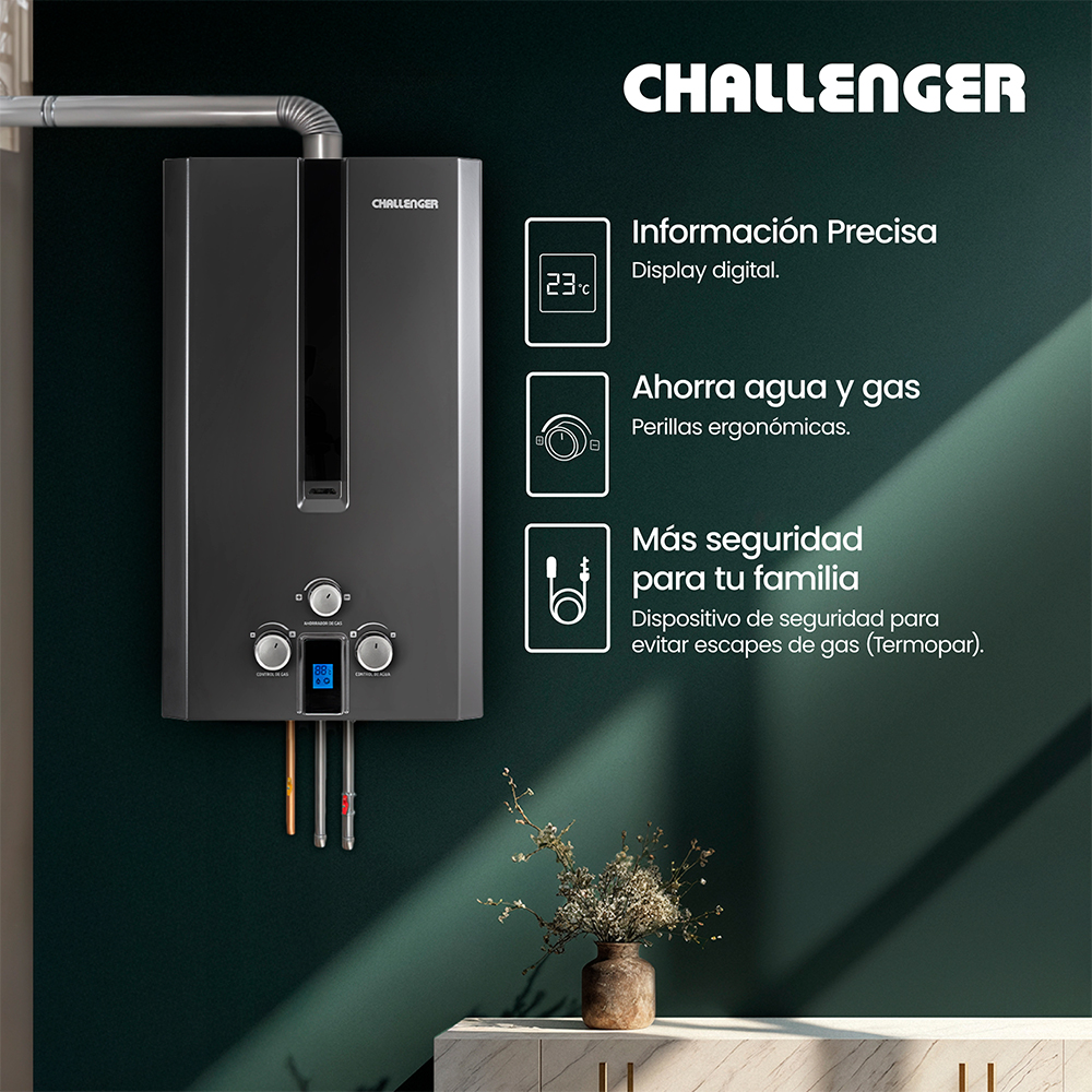 Calentador de paso a gas Challenger 10 Lts Tiro Forzado. Acabado en color negro, perillas ergonómicas lo hacen lucir elegante y fácil de usar. Panel digital que indica la temperatura , encendido automático que te brinda agua caliente . Incluye múltiples sistemas de seguridad que cuidan el bienestar de tu familia. Además, incluye la función de ahorro de gas que te permite regular el consumo de gas sin sacrificar el confort.