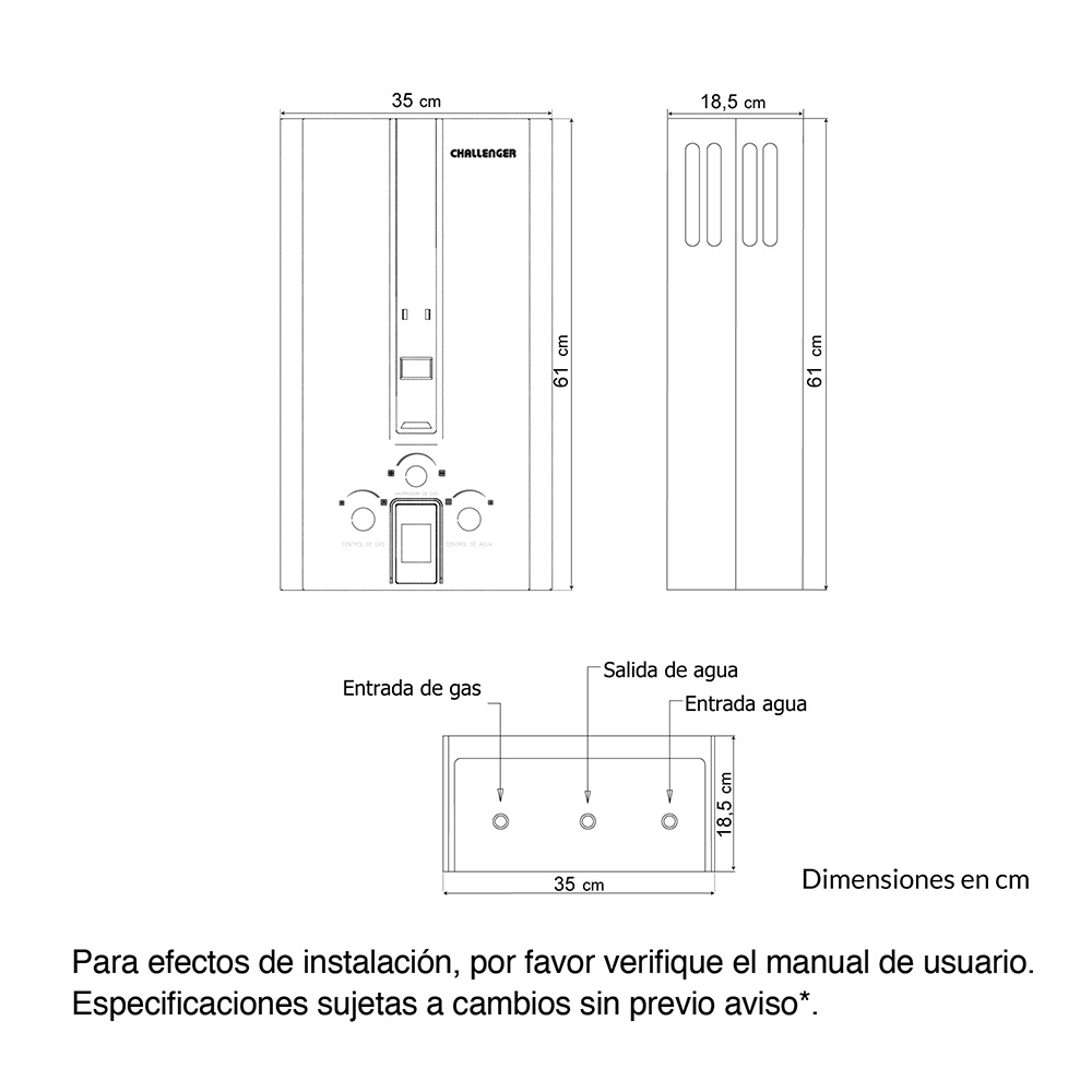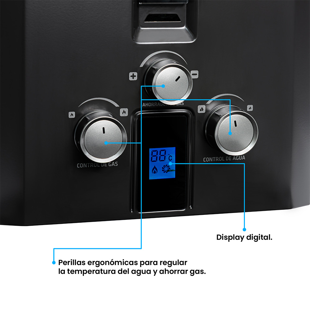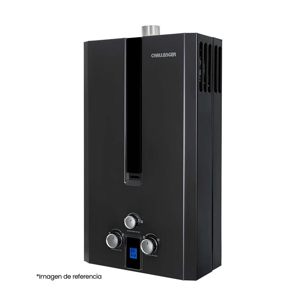 Calentador de paso a gas Challenger 12 Lts Tiro Forzado. Acabado en color negro, perillas ergonómicas lo hacen lucir elegante y fácil de usar. Panel digital que indica la temperatura , encendido automático que te brinda agua caliente . Incluye múltiples sistemas de seguridad que cuidan el bienestar de tu familia. Además, incluye la función de ahorro de gas que te permite regular el consumo de gas sin sacrificar el confort.