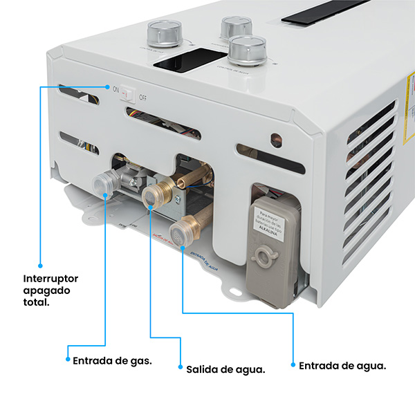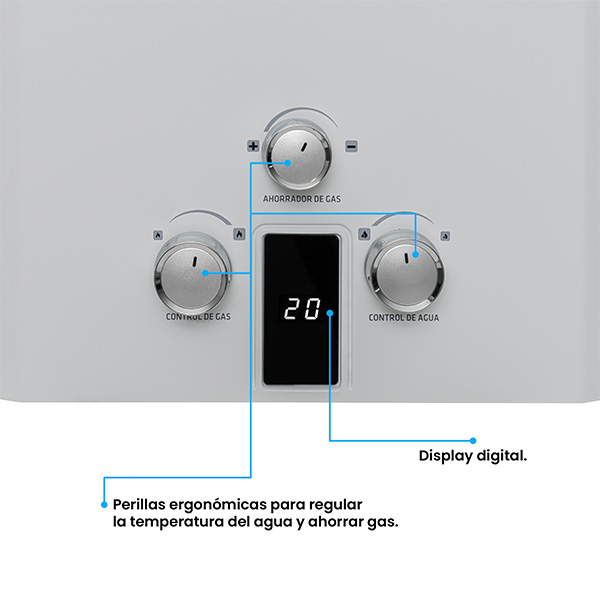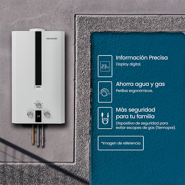 Calentador de paso a gas Challenger 16 Lts Tiro Natural. Acabado en color blanco, vidrio templado negro y perillas ergonómicas lo hacen lucir elegante y fácil de usar. Panel digital que indica la temperatura , encendido automático que te brinda agua caliente . Incluye múltiples sistemas de seguridad que cuidan el bienestar de tu familia. Además, incluye la función de ahorro de gas que te permite regular el consumo de gas sin sacrificar el confort.